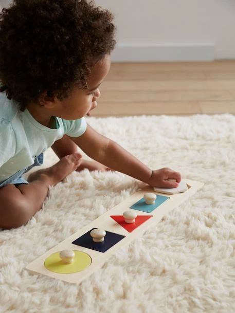 Un puzzle avec de grandes pièces et de gros boutons pour aider les enfants à réaliser leur premier puzzle dès 10 mois ! Avec ces formes géométriques basiques, l’enfant découvre les formes, les couleurs et fait l’apprentissage de l’encastrement.