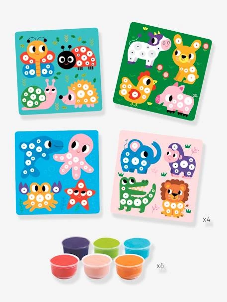 Découvrez le coffret Ronds de pâte à modeler de Djeco pour des créations uniques. Il comprends des tableaux à compléter avec les animaux de la savane, les animaux de la ferme, les animaux marins et les animaux du jardin. Votre enfant pourra ainsi compléter les dessins avec des ronds de pâte à modeler afin de donner du volume aux animaux . Une belle activité pour développer de manière ludique sa créativité et stimuler son imagination.