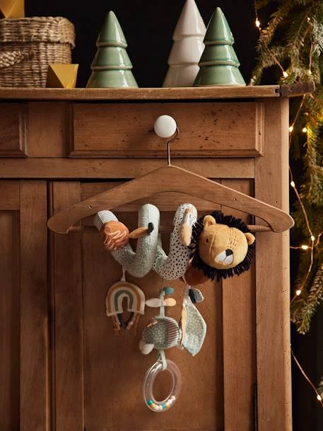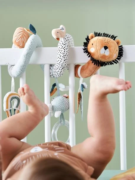 - Spirale avec 3 jouets : une feuille, une tortue hochet à billes, un arc-en-ciel avec rubans et grelot