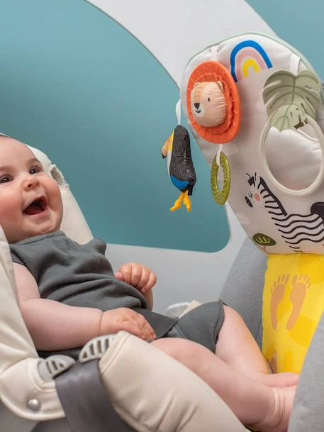 - En bas du centre d’activités est inclus un jouet électronique avec sons et lumières, déclenchés par les coups de pieds de bébé. Cela permet au bébé de comprendre la relation de cause à effet.